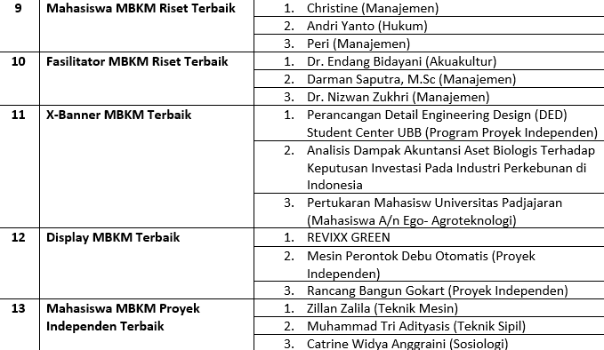 Mengusung tema “Tumbuh Kembang Inovasi Penelitian, Pengabdian dan MBKM Menuju Tridharma Berdaya Guna" kegiatan MBKM UBB pada tahun ini diikuti kurang lebih 1.024 mahasiswa baik yang didanai oleh UBB maupun pendanaan dari kementerian.