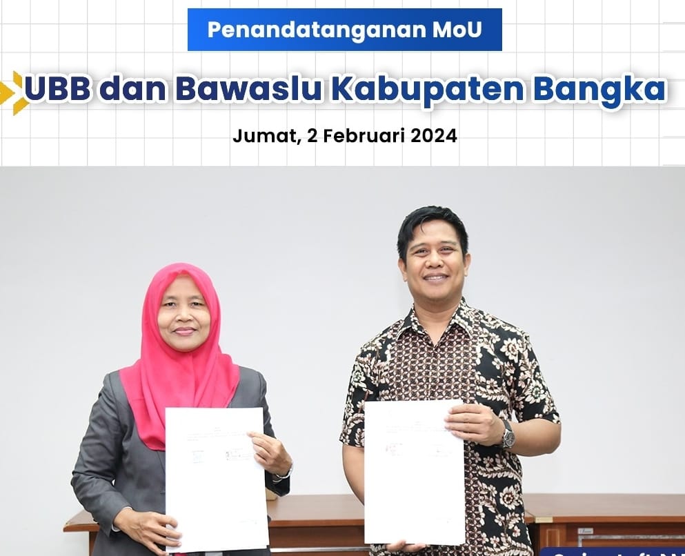 Merawang, UBB—Universitas Bangka Belitung (UBB) dan Badan Pengawas Pemilu (Bawaslu) Kabupaten Bangka laksanakan penandatanganan Kerjasama terkait pengawasan partisipatif dalam kontestasi pemilu dan Tridarma perguruan tinggi, bertempat di Betason II, Gedung Rektorat UBB.